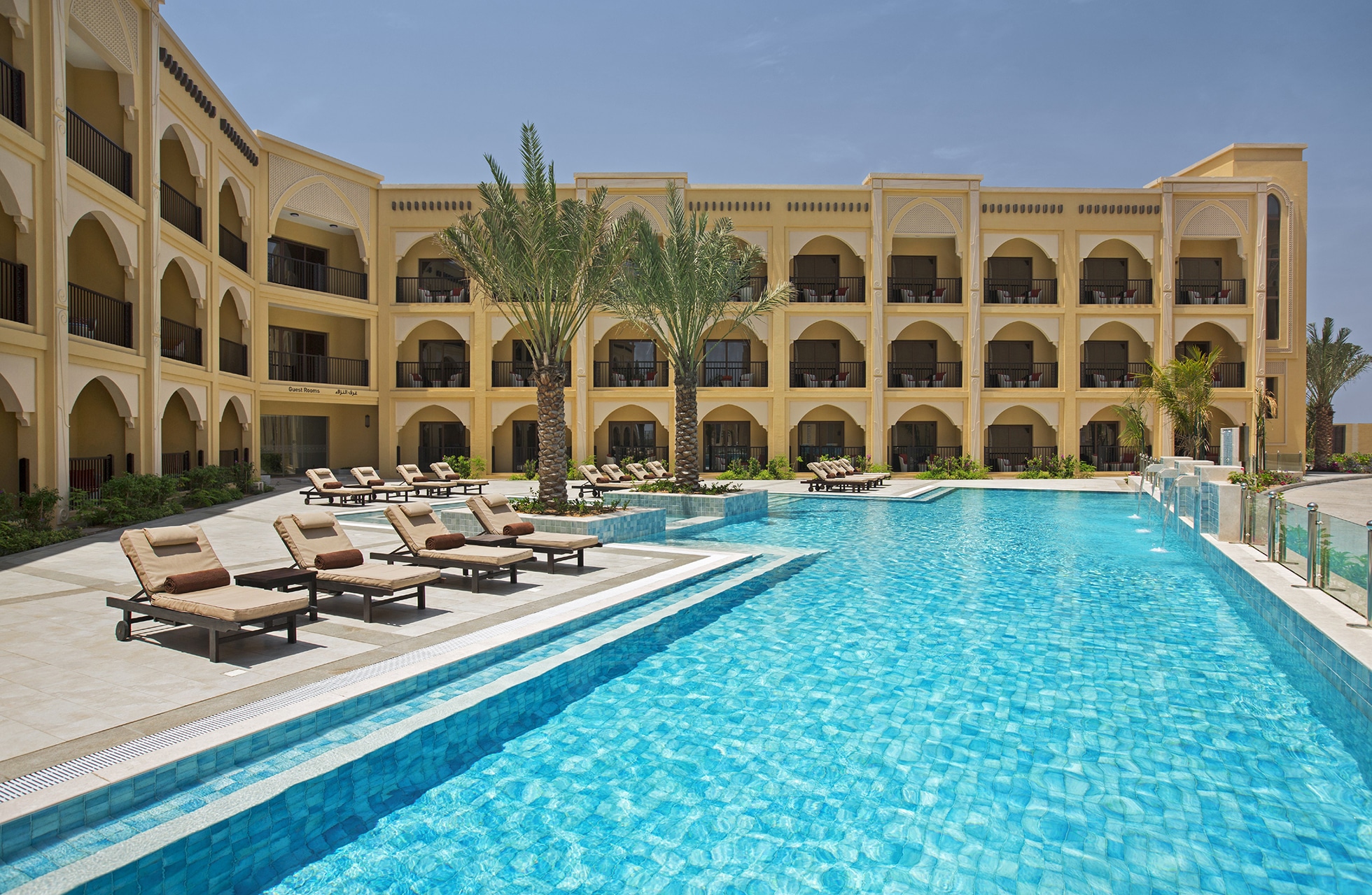 Golf Plaisir har valgt det 5-stjerners Doubletree by Hilton Resort & Spa Marjan Island, som ligger ytterst på en odde omgitt av den varme Persiabukta. Her kan man glede seg over en rekke vannsporter eller bare nyte dagen på den private, finkornede, hvite sandstranden som ligger noen få meter fra hotellet. Hotellet er lekkert, alle rom har havutsikt og balkong. Rommene er moderne og praktiske. På hotellet finner du alle tenkelige bekvemmeligheter, blant annet flere barer og restauranter samt et treningsrom. Foruten det rikelige utvalget på frokostbufféen hver morgen er seks middager i bufférestauranten inkludert. Glem ikke å avlegge baren helt på toppen av hotellet et besøk, herlig utsikt garanteres. Transporten til golfbanen tar cirka 5-7 minutter og er inkludert i prisen, den kjører etter fast tidtabell.